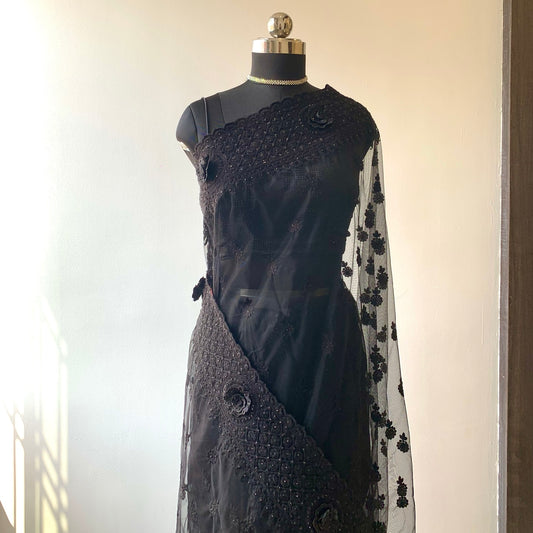 Black Net Saree With Floral Threadwork And Unstitched Blouse Piece