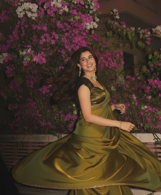Earthy Elegance: Olive Green Patchwork Print Saree