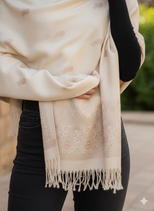 Blush Beige Kashmiri-Style Paisley Jacquard Shawl