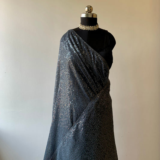Black Net Saree With Floral Threadwork And Unstitched Blouse Piece