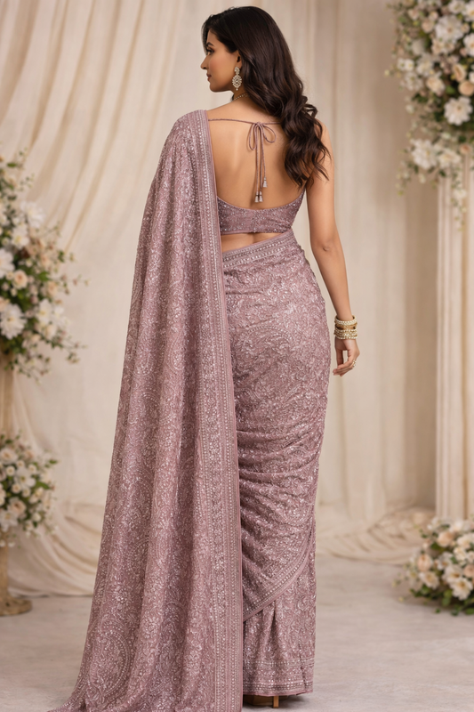 Blush Pink Hand-Embellished Net Saree