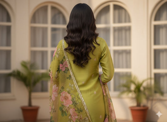 Mustard Yellow Printed Mirror-Work Kurta Set