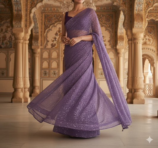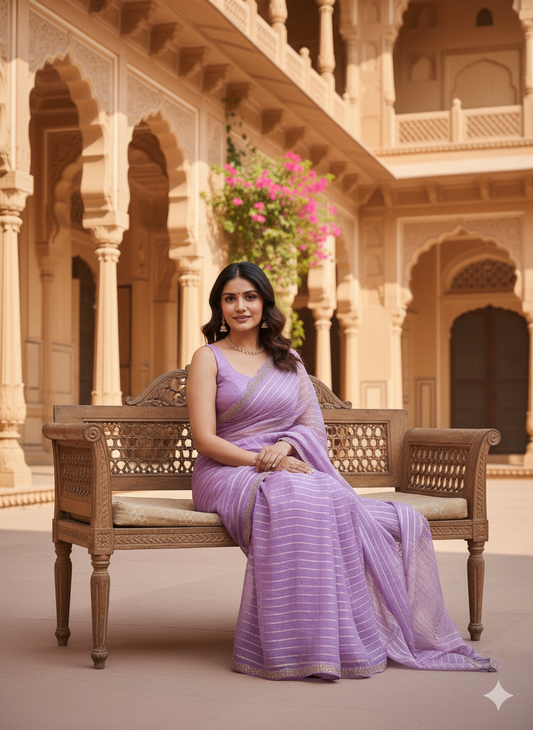 Shimmering Lavender Saree with Gold Stripes & Sequin Border