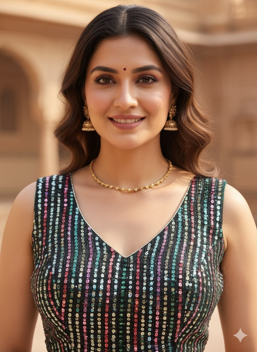 Shine brighter than the night in this stunning black sequin blouse from Bhadani Label. Designed with multi-colored vertical sequins that catch the light from every angle, this blouse adds an instant dose of glam to any saree or lehenga.
