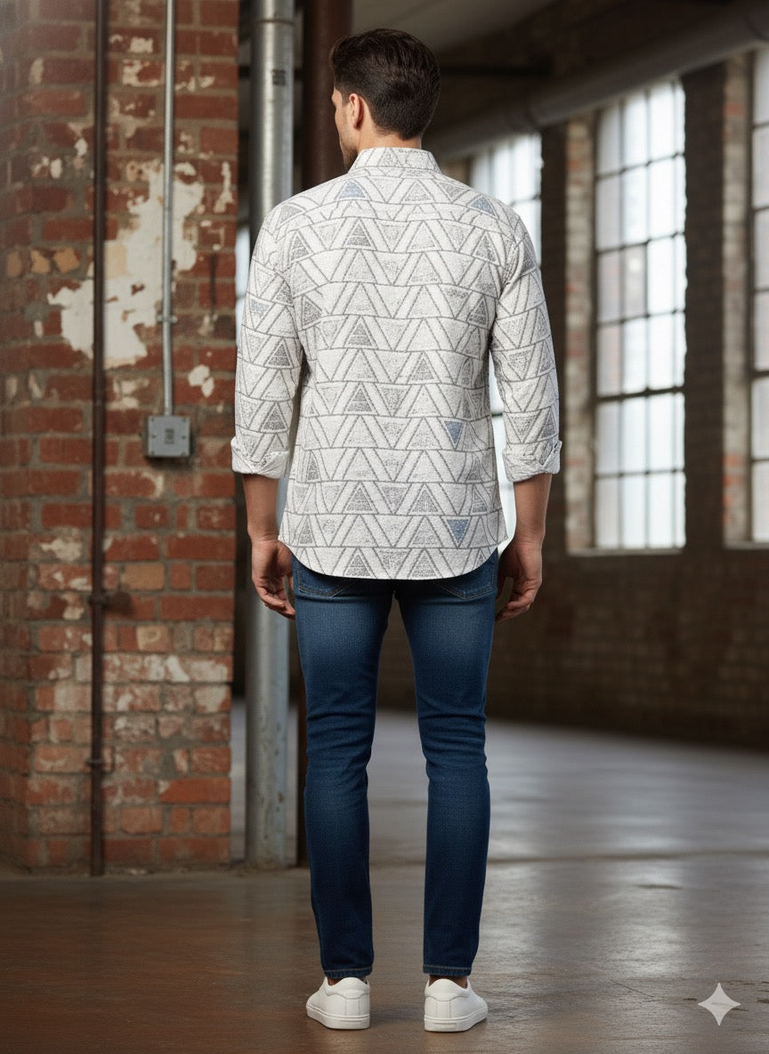 Stand out effortlessly in this White Geometric Printed Casual Shirt, crafted for a relaxed yet refined look. Made from soft, breathable cotton, it features a modern triangle pattern that adds a contemporary edge to your casual wardrobe.